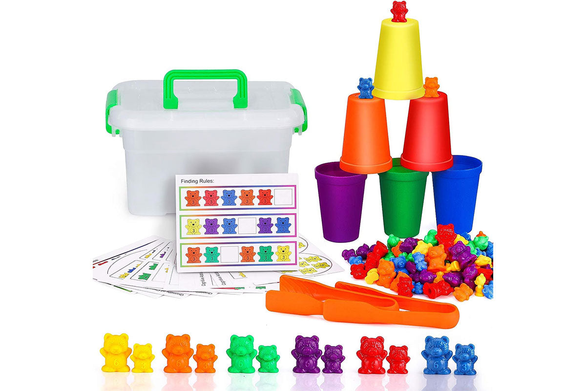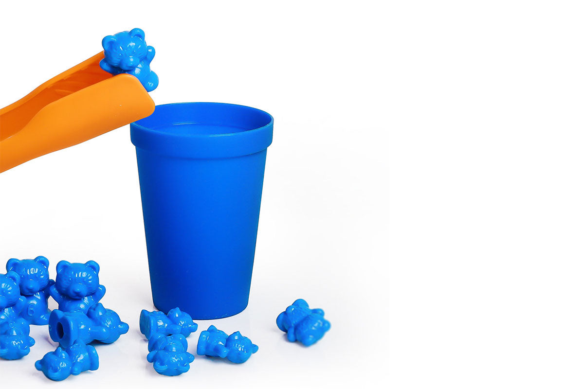 Dieses vielseitige Spiel enthält 60 kleine Bären, 30 große Bären, 6 Becher, 2 Greifzangen und 11 spannende Aufgabenkarten. Es bietet zahlreiche Spielmöglichkeiten, um spielerisch wichtige Fähigkeiten zu fördern: