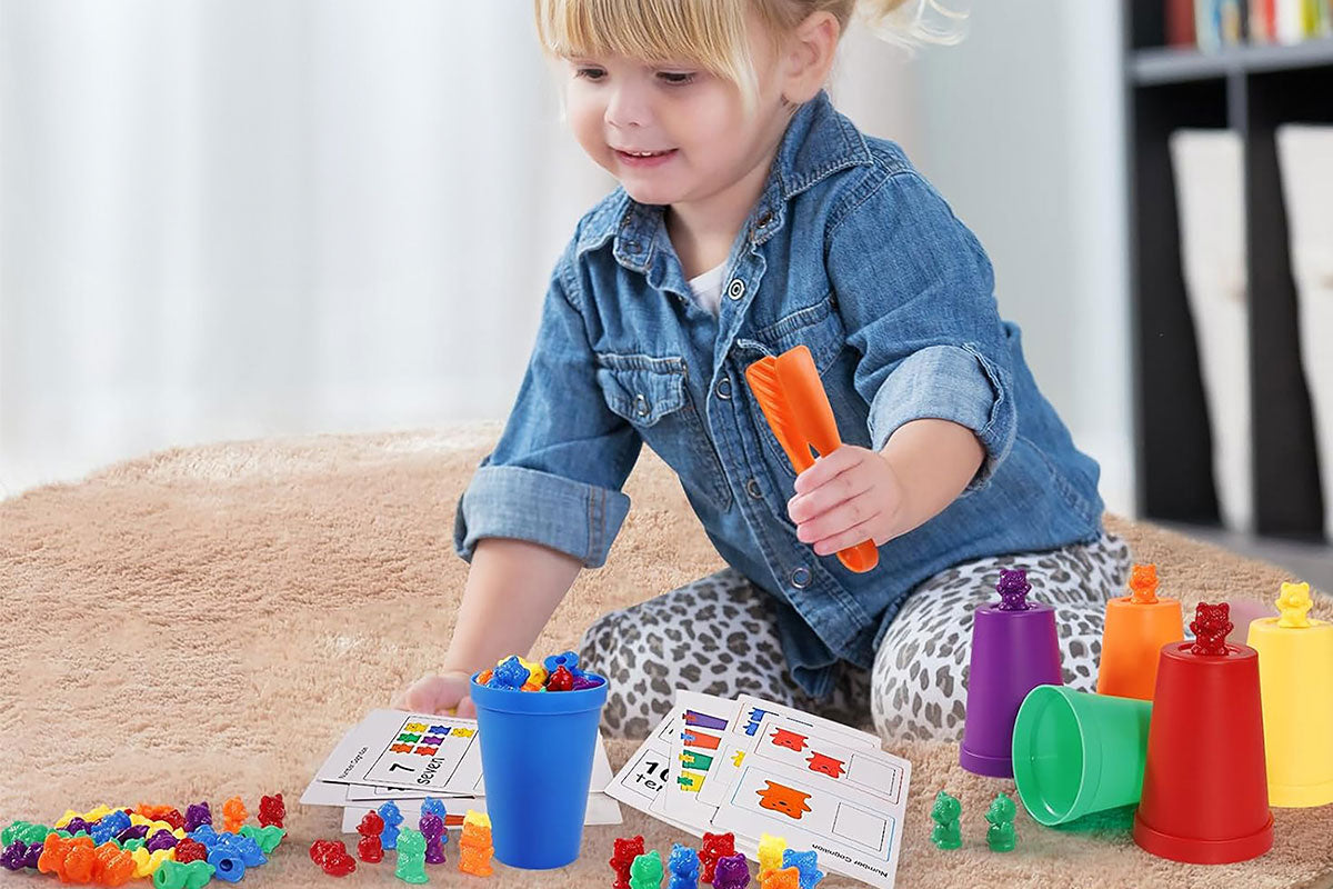 Spielmöglichkeit 1: Bären nach Größe und Farbe sortieren – perfekt, um Beobachtungsgabe und Feinmotorik zu trainieren.
