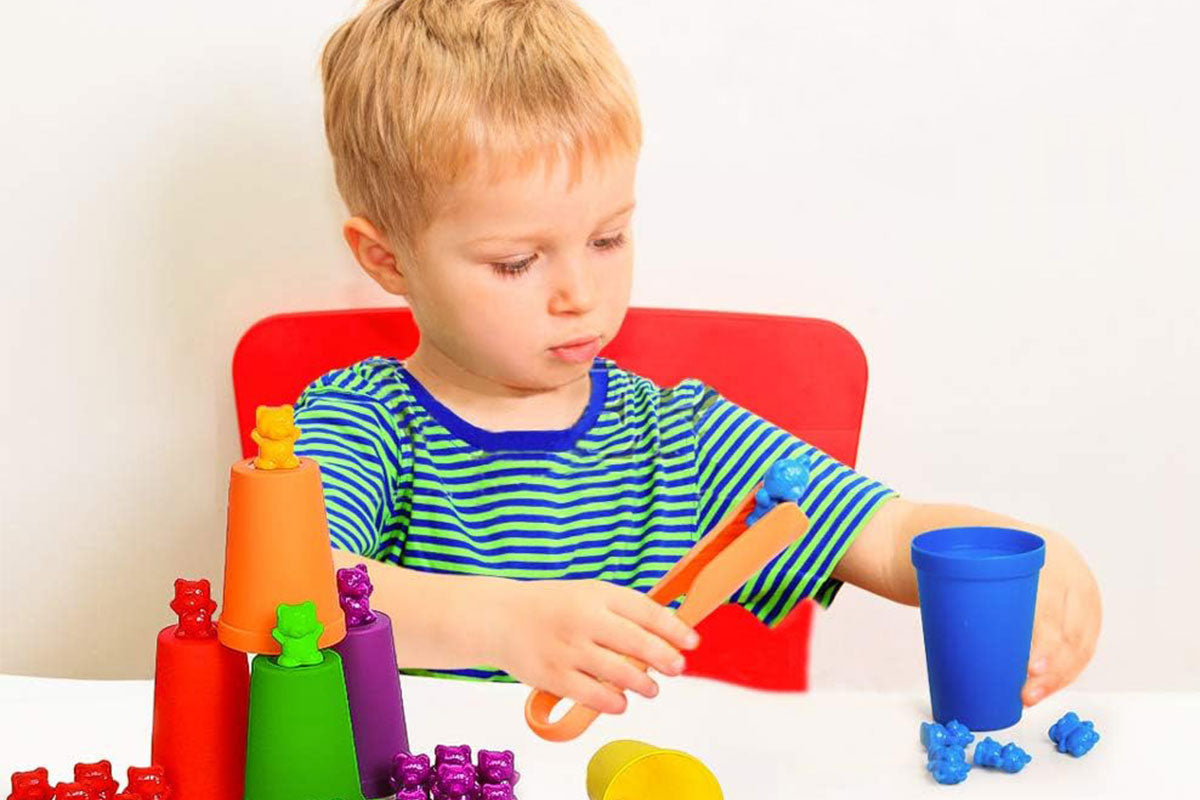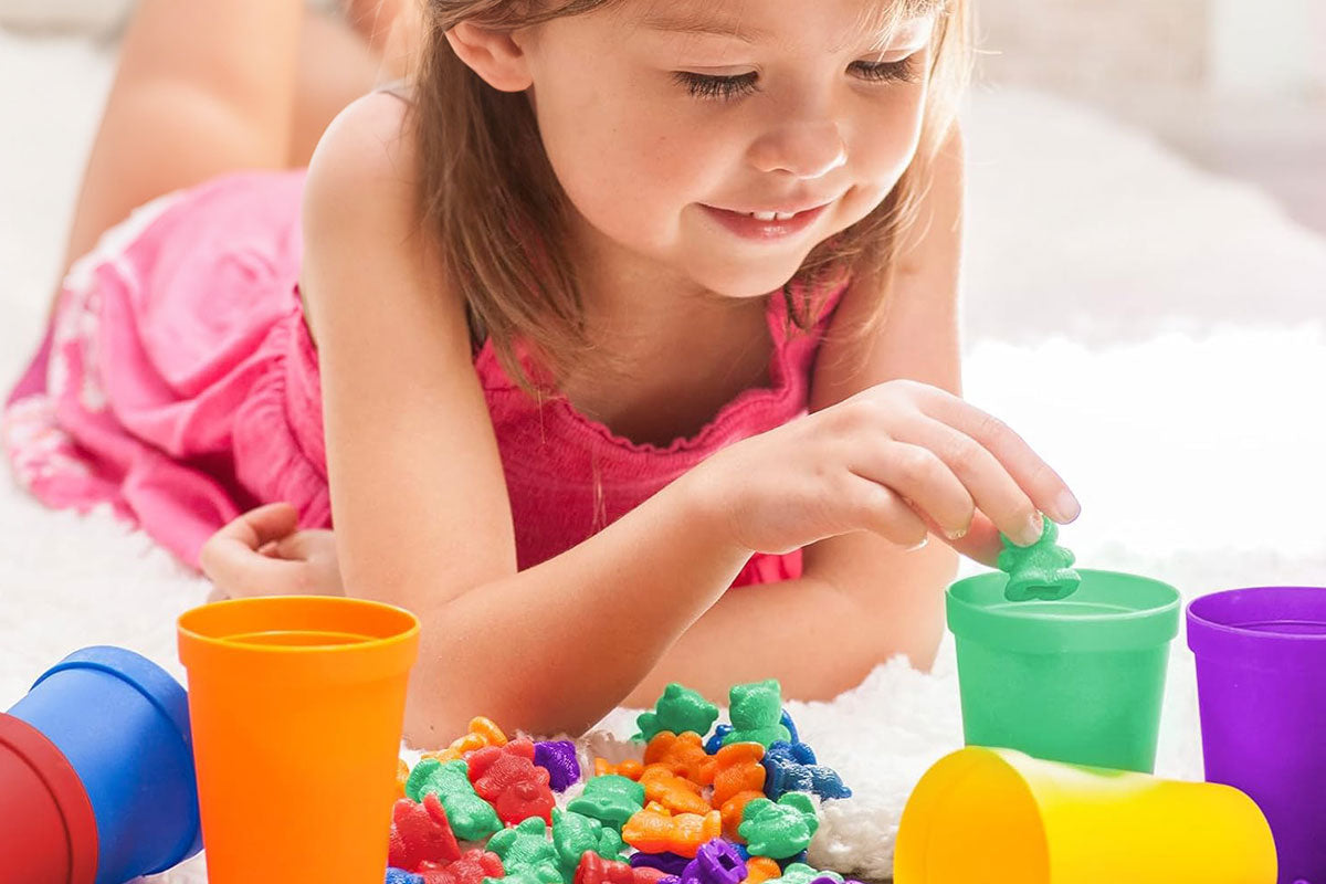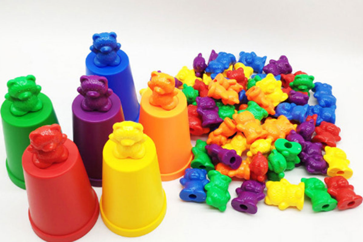 Spielmöglichkeit 2: Bären nach Farbe in die passenden Becher sortieren – ideal für das Erkennen von Farben und erste Mengenverständnis.