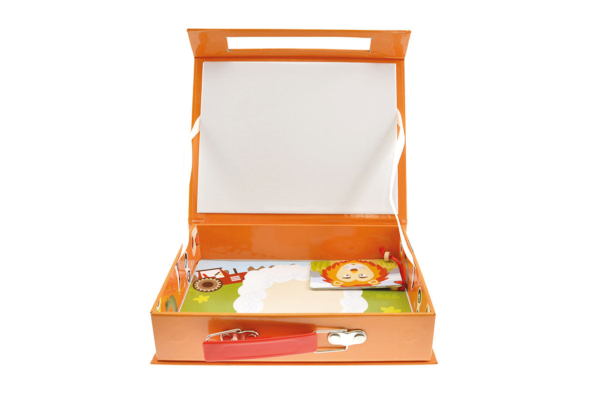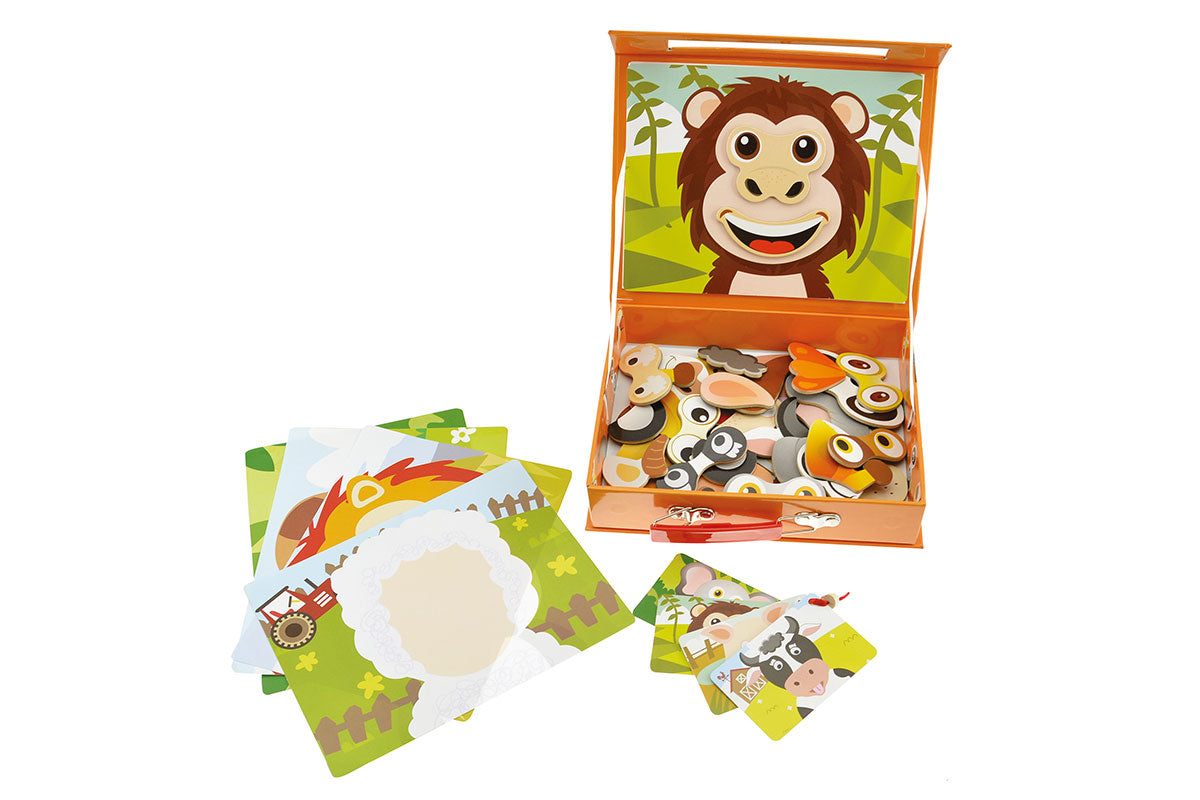 To keep all the pieces together, the funny, magnetic animal faces have their home in a sturdy, beautiful tin case.