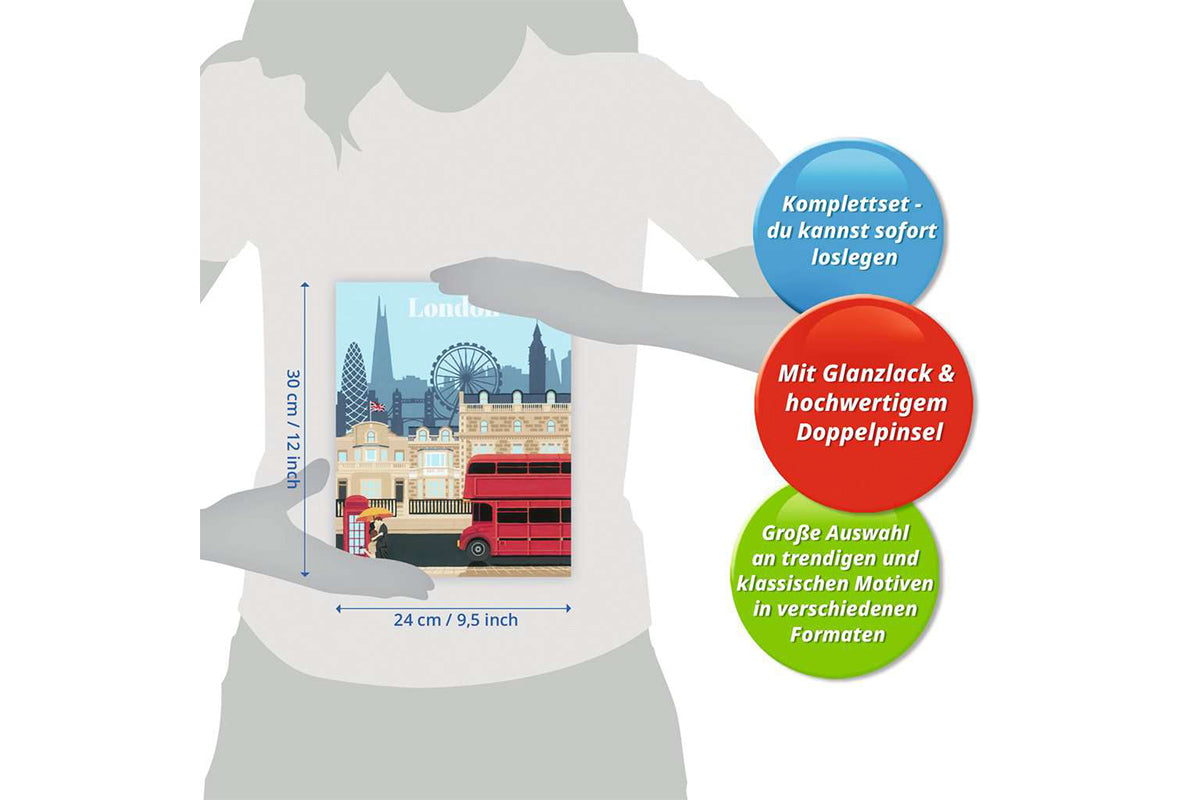 New York, Paris, Mailand und viele mehr! Entdecken Sie die schönsten Städte der Welt und holen Sie sich mit unseren Malen nach Zahlen-Sets ihren Zauber direkt zu sich nach Hause! Das trendige Motiv Farbenfrohes London bietet großartigen Malspaß für Erwachsene ab 12. Die Motivlinien sind bereits aufgedruckt und nummeriert und werden mit den fertig gemischten Acrylfarben ausgemalt. Das ist Malspaß mit Erfolgsgarantie für eine einzigartige Wanddekoration Ihrer Stadt. Malen war noch nie so einfach!Mit CreArt - Malen nach Zahlen von Ravensburger den Weg zur inneren Ruhe und Entspannung finden. Einfach auspacken und los malen: jedes Malset enthält alles, was zum Malen benötigt wird und es ist kein Mischen der Farben notwendig. Das fertig gemalte Bild eignet sich als trendige Dekoration in jedem Zuhause. Das Ravensburger CreArt - Malen nach Zahlen Programm bietet eine große Motivauswahl für Kinder und Erwachsene.