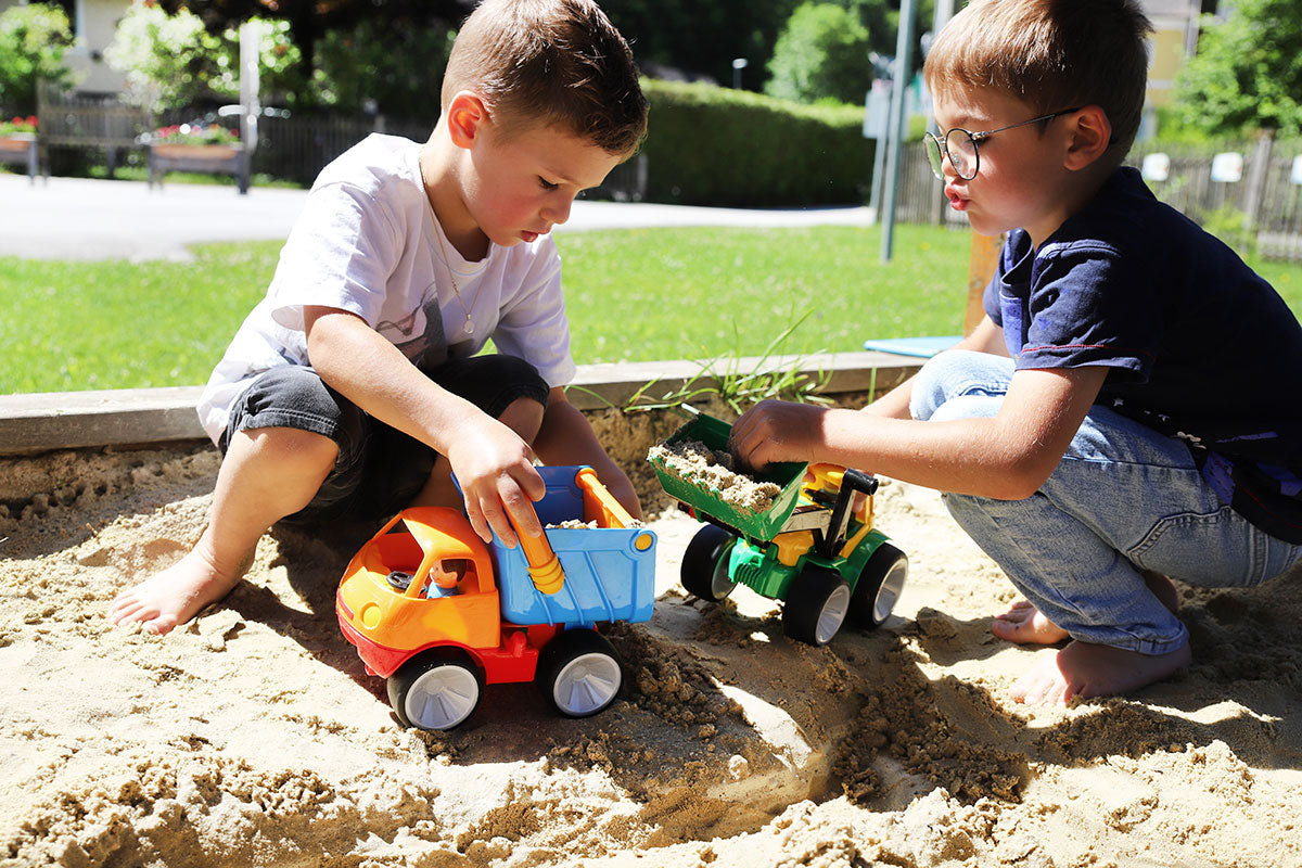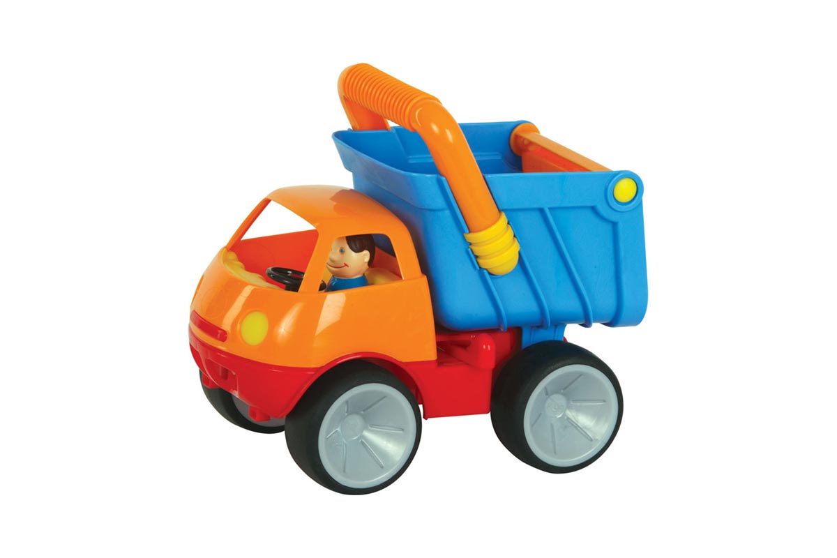 Das Fahrzeug besticht mit seinen gummierten Räder und seiner starken Stahlachse, mit der der Kipper einiges an Gewicht aushält. Es besteht außerdem aus hochwertigem Kunststoff und lässt sich leicht unter fließendem Wasser oder mit einem feuchten Tuch reinigen.