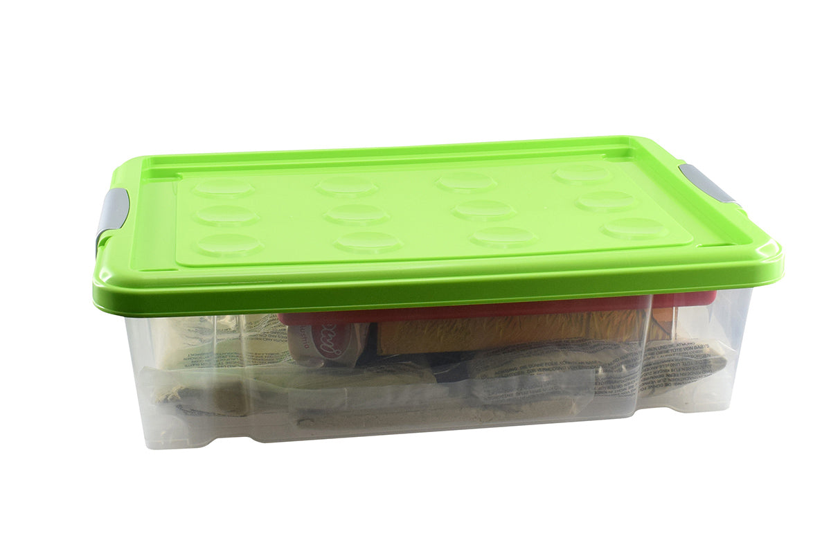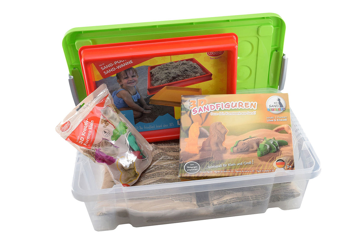 Nach dem Spielen kann der Sand, die Wanne und die 3D Förmchen in der großen Spielkiste verstaut werden, damit alles bereit für den nächsten Einsatz ist!