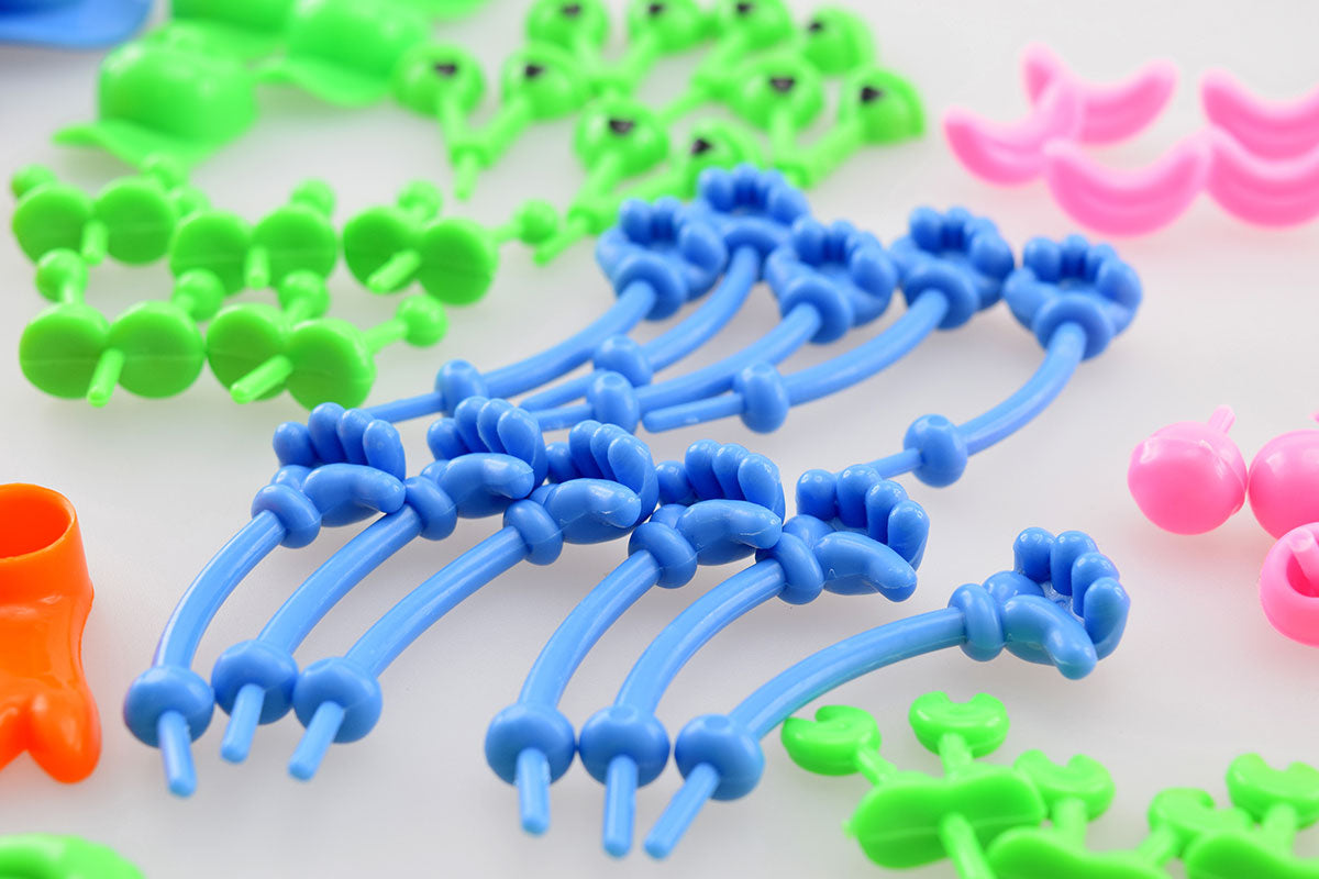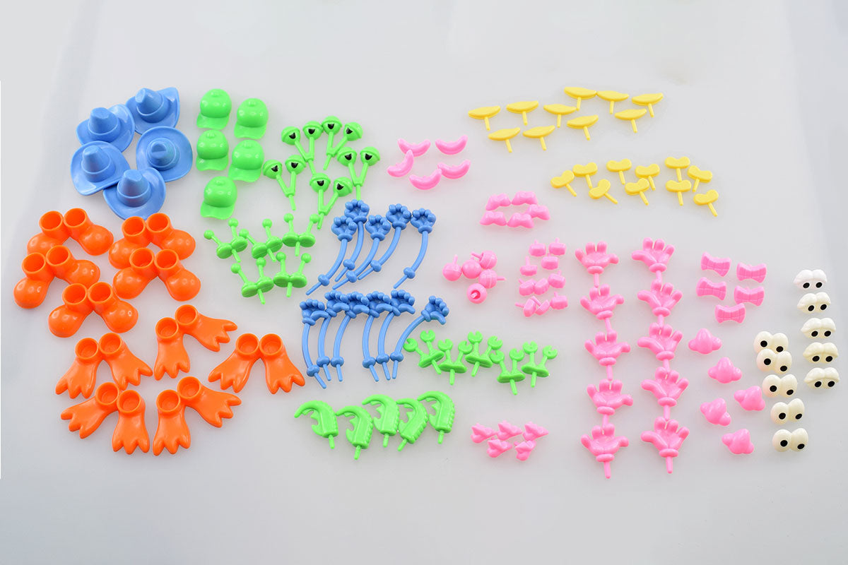 Im Set sind 128 Teile enthalten, die Ihren klumpen Knete in eine lustige Knetfigur verwandelt. Sie können zwischen verschiedenartigen und bunten Teilen, wie Gliedmaßen, Augen und Kopfbedeckungen wählen. Im Set ist keine Knete enthalten!