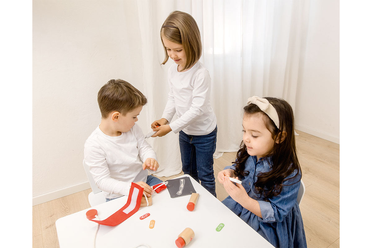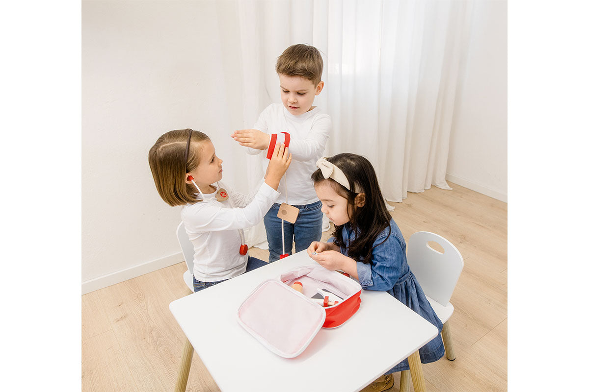 Mit der Rollenspieltasche ,Arzt´ sind kleine Nachwuchsmediziner bestens ausgestattet! Die praktische Baumwolltasche enthält liebevoll gestaltetes Zubehör aus FSC®-zertifiziertem, hochwertigem Holz: Stethoskop, Blutdruckmessgerät, Salbe, Medikamentendose, Spritze, Fieberthermometer, Tabletten und Röntgenaufnahmen.