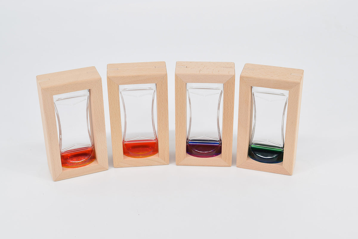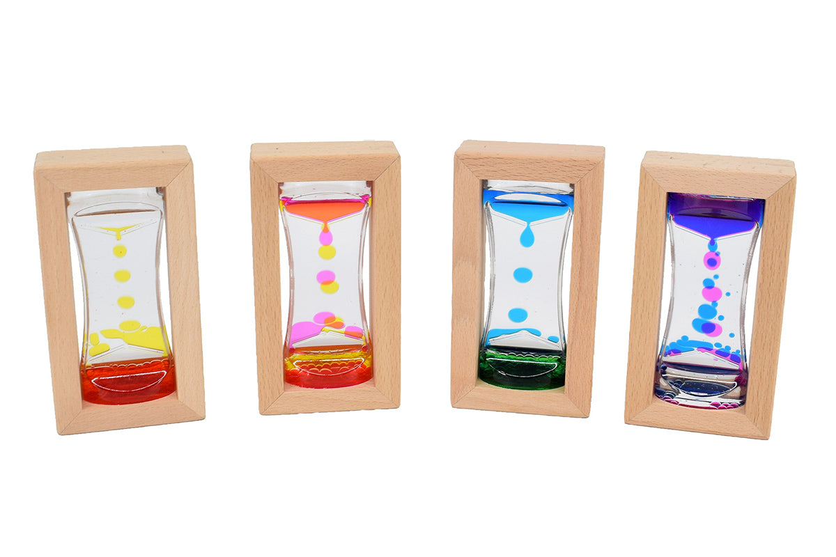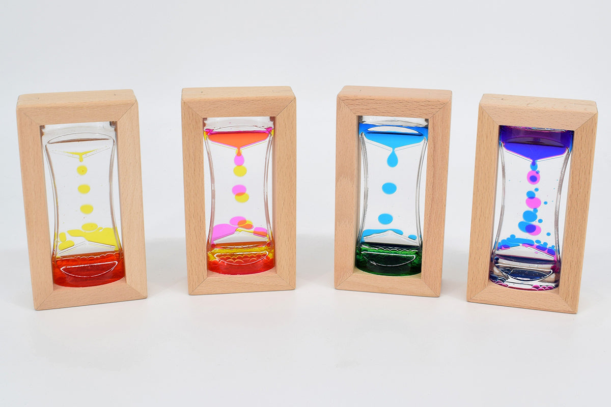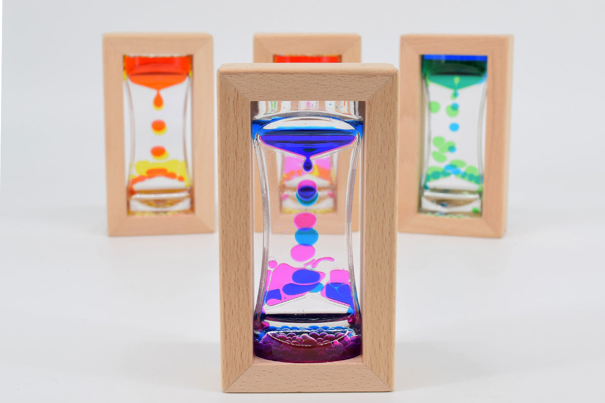 Durch das der langsame Tropfen entsteht ein beruhigender Ablauf, der sowohl Konzentration als auch Entspannung unterstützt. Die Sanduhr eignet sich ideal als sensorisches Element im pädagogischen Alltag, für kleine Auszeiten, als Fokus-Hilfe oder für Entspannungs- und Meditationseinheiten. Kinder verfolgen gebannt die gleichmäßige Bewegung der Tropfen und trainieren dabei Aufmerksamkeit, Ausdauer und emotionale Regulation. Der stabile Holzrahmen sorgt für eine angenehme Haptik, während die transparente Flüssigkeitskammer den Blick auf das Farbspiel freigibt.