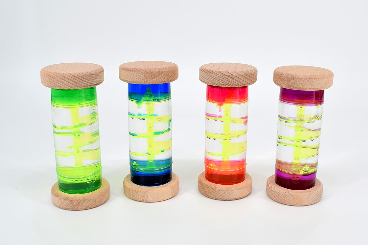 Durch das langsame Hinabfließen der farbigen Tropfen in der Spirale entsteht ein beruhigender Ablauf, der sowohl Konzentration als auch Entspannung unterstützt. Die Sanduhr eignet sich ideal als sensorisches Element im pädagogischen Alltag, für kleine Auszeiten, als Fokus-Hilfe oder für Entspannungs- und Meditationseinheiten. Kinder verfolgen gebannt die gleichmäßige Bewegung der Tropfen und trainieren dabei Aufmerksamkeit, Ausdauer und emotionale Regulation. Der stabile Holzrahmen sorgt für eine angenehme Haptik, während die transparente Flüssigkeitskammer den Blick auf das Farbspiel freigibt.