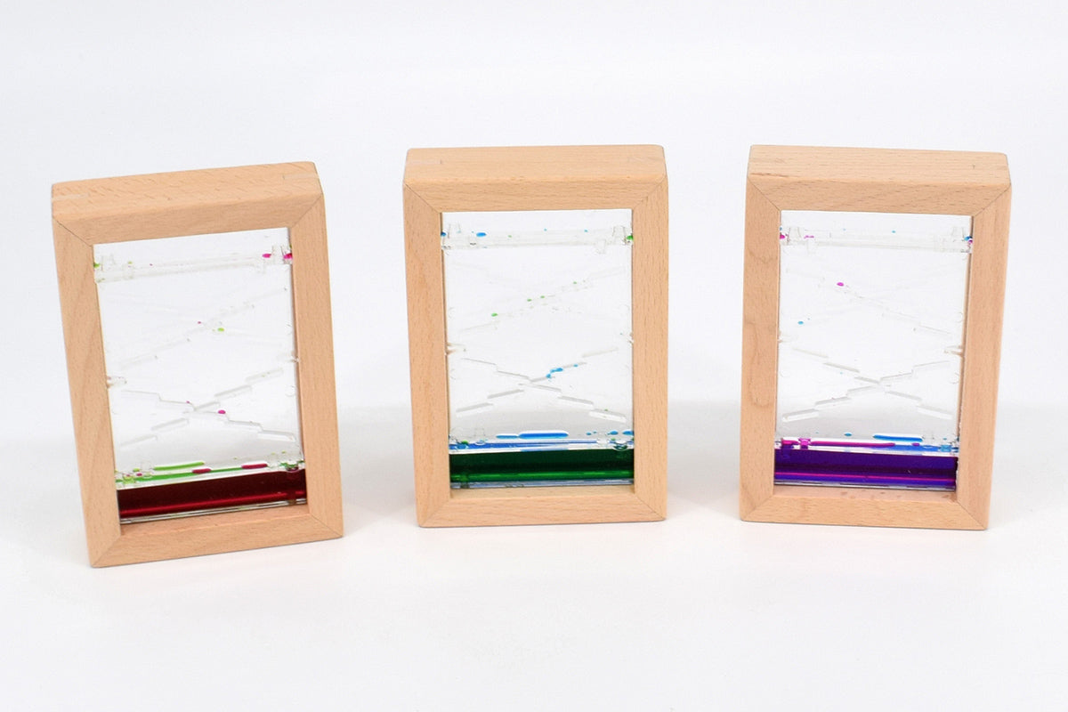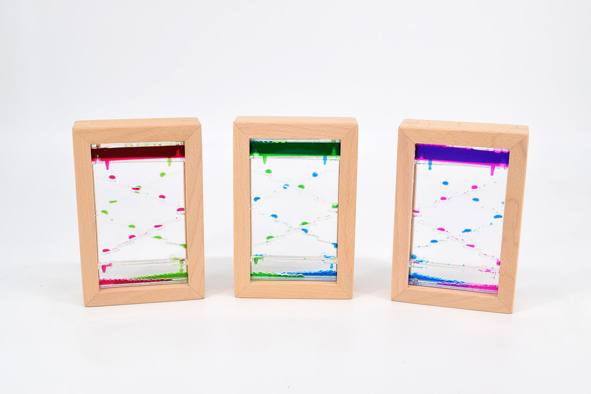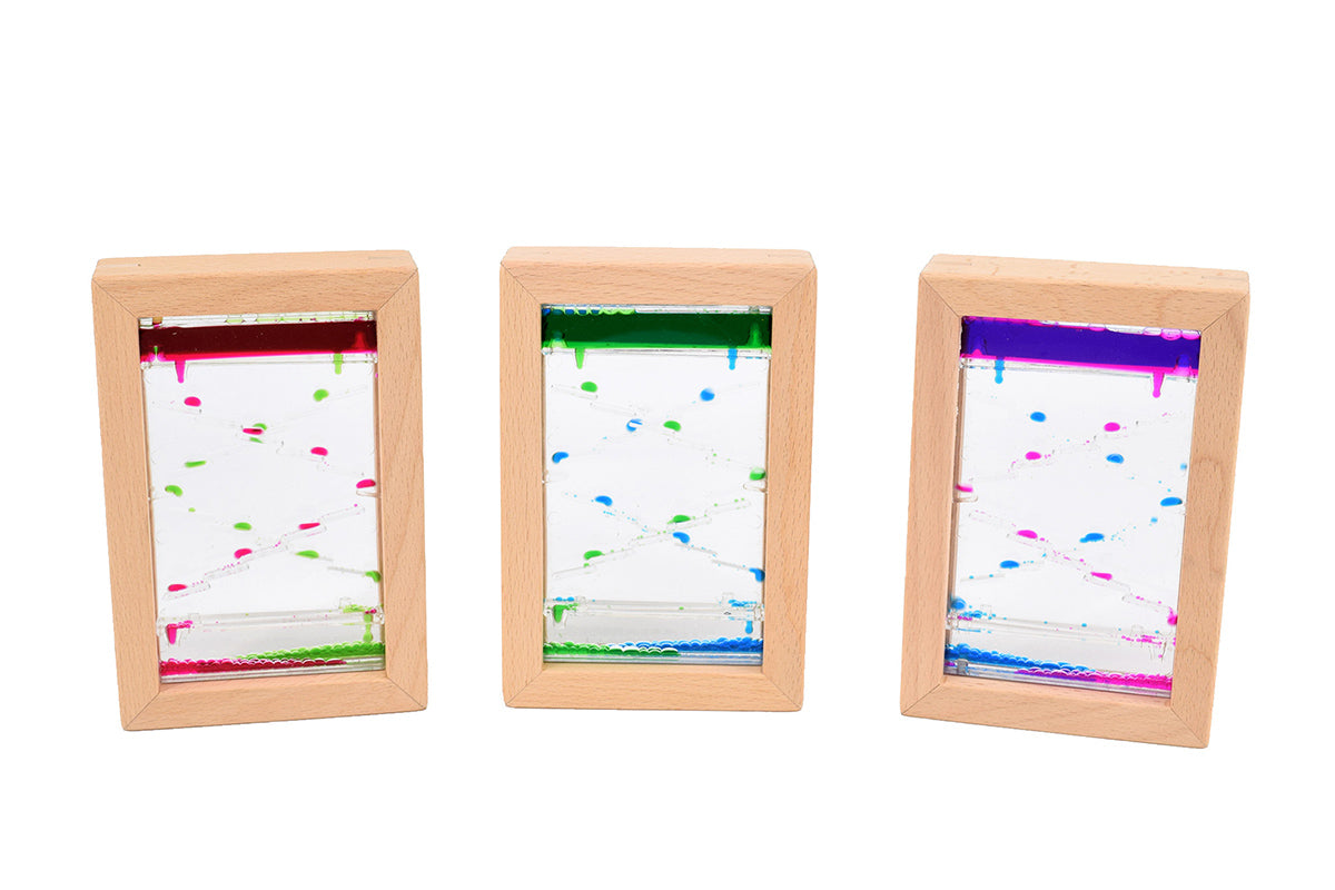 Durch das langsame Hinabfließen der farbigen Tropfen über die kleinen Stufen entsteht ein beruhigender Ablauf, der sowohl Konzentration als auch Entspannung unterstützt. Die Sanduhr eignet sich ideal als sensorisches Element im pädagogischen Alltag, für kleine Auszeiten, als Fokus-Hilfe oder für Entspannungs- und Meditationseinheiten. Kinder verfolgen gebannt die gleichmäßige Bewegung der Tropfen und trainieren dabei Aufmerksamkeit, Ausdauer und emotionale Regulation. Der stabile Holzrahmen sorgt für eine angenehme Haptik, während die transparente Flüssigkeitskammer den Blick auf das Farbspiel freigibt.