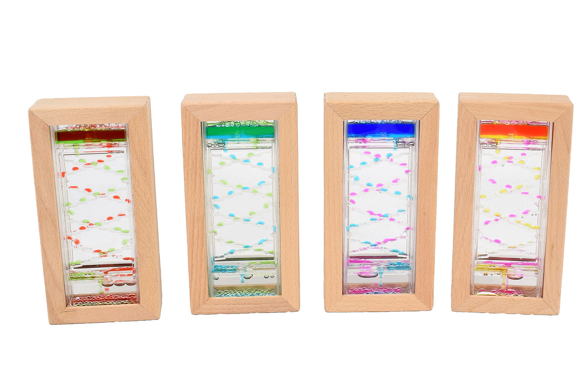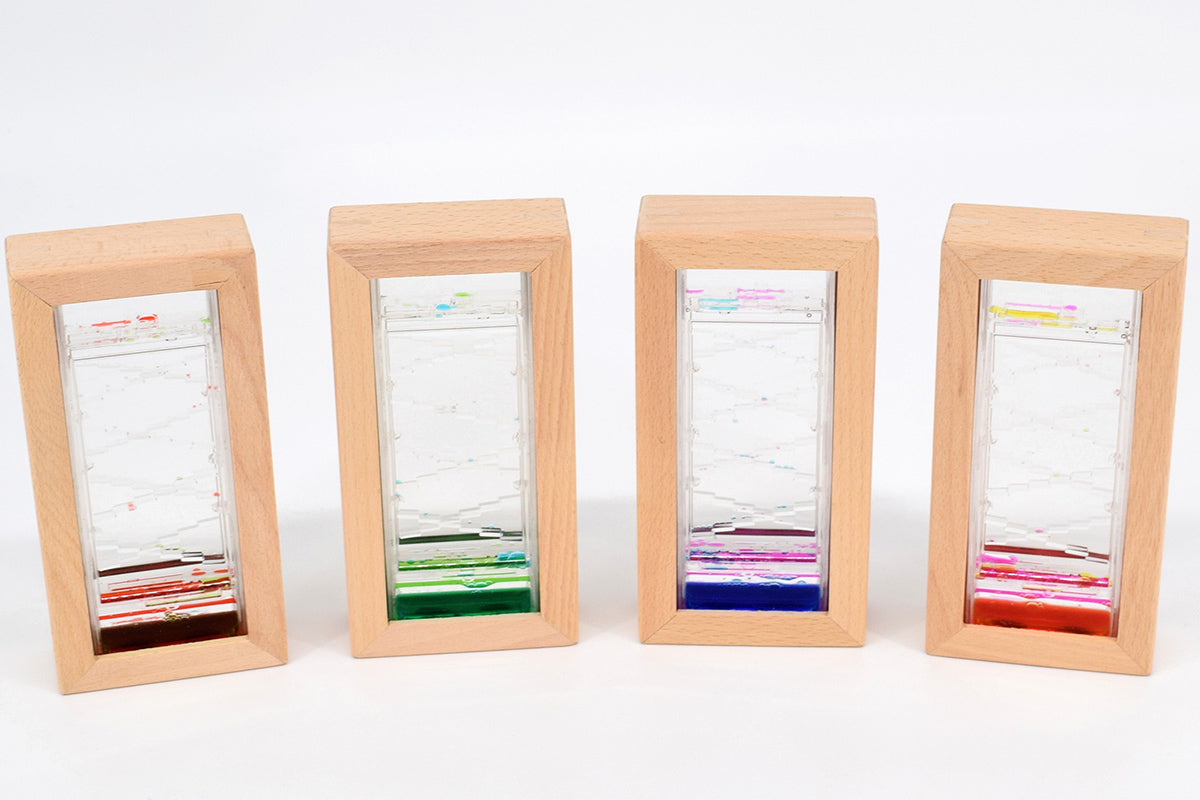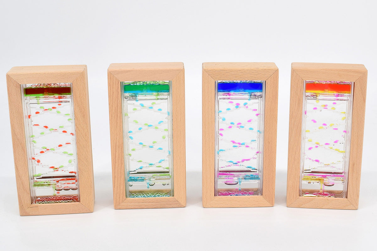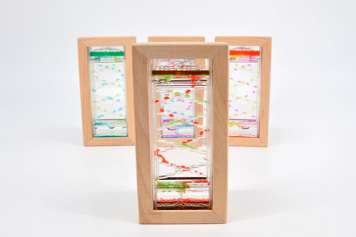 Durch das langsame Hinabfließen der farbigen Tropfen über die kleinen Stufen entsteht ein beruhigender Ablauf, der sowohl Konzentration als auch Entspannung unterstützt. Die Sanduhr eignet sich ideal als sensorisches Element im pädagogischen Alltag, für kleine Auszeiten, als Fokus-Hilfe oder für Entspannungs- und Meditationseinheiten. Kinder verfolgen gebannt die gleichmäßige Bewegung der Tropfen und trainieren dabei Aufmerksamkeit, Ausdauer und emotionale Regulation. Der stabile Holzrahmen sorgt für eine angenehme Haptik, während die transparente Flüssigkeitskammer den Blick auf das Farbspiel freigibt.