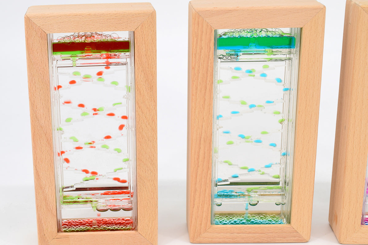 Die flüssige Sanduhr „Treppe klein“ im Holzrahmen bietet faszinierende visuelle Effekte und lädt zum Beobachten ruhiger Tropfenbewegungen ein.