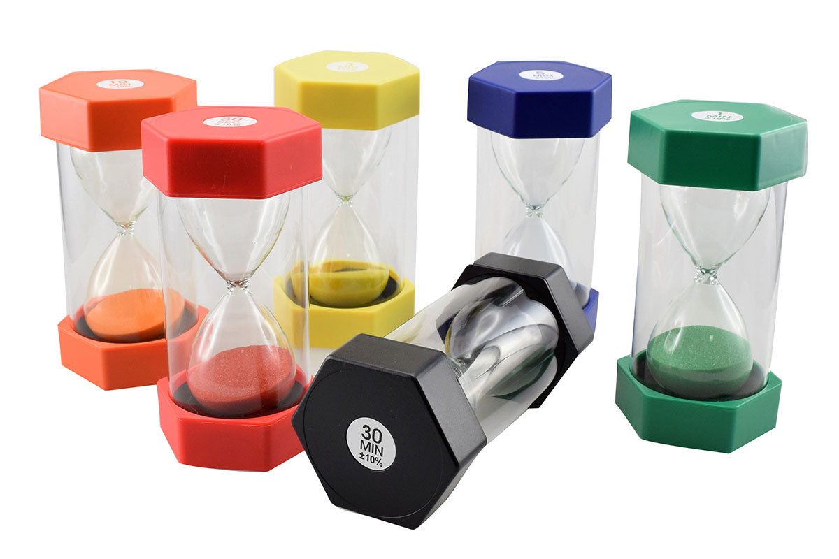Insgesamt sechs Sanduhren mit jeweils einer Zeit von 30 Sek., 1 min, 3min, 5min, 10min und 30min!